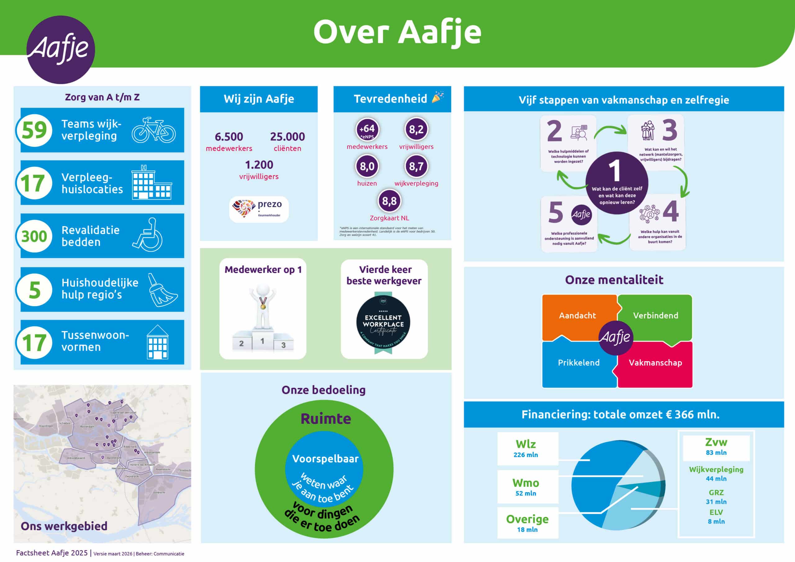 Bij Aafje hebben we huizen, revalidatielocaties en bieden we wijkverpleging. Onze mentaliteit vormt de basis voor onze dagelijkse zorgverlening. In deze factsheet vindt u in één oogopslag ons verhaal. Klik hier om al onze feiten en cijfers te lezen.